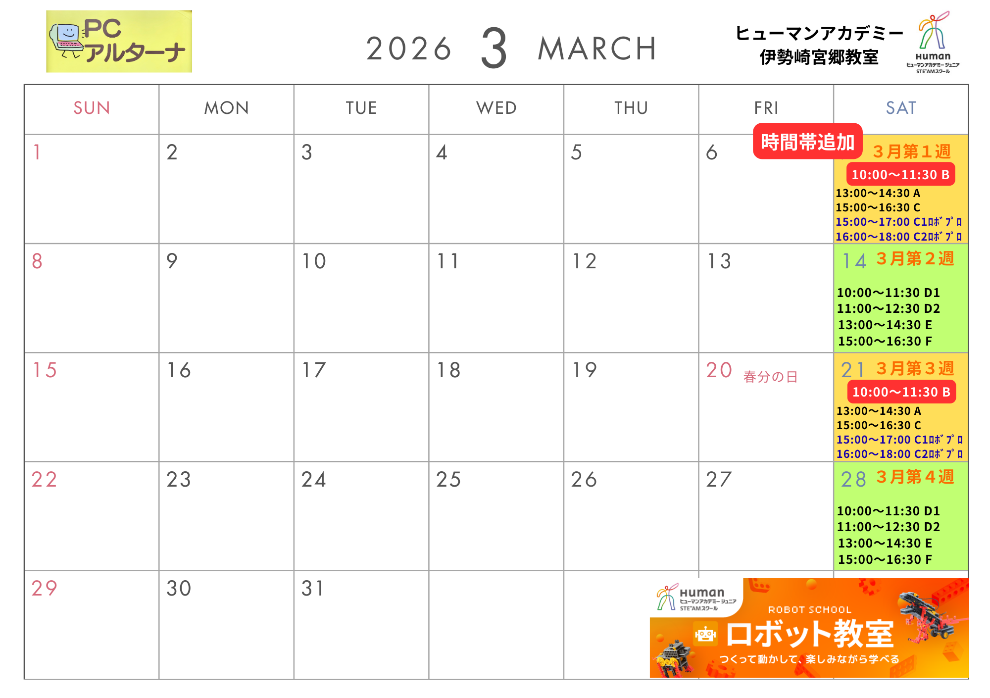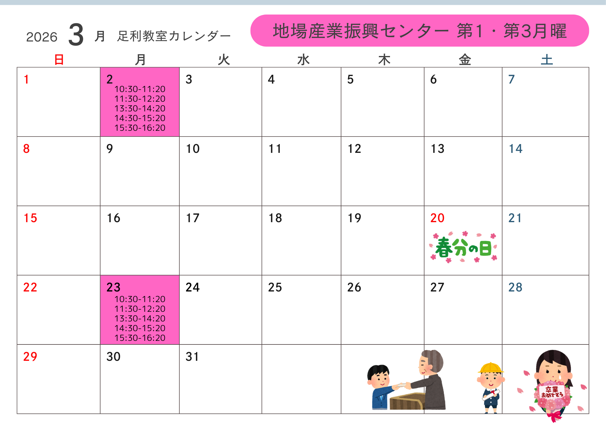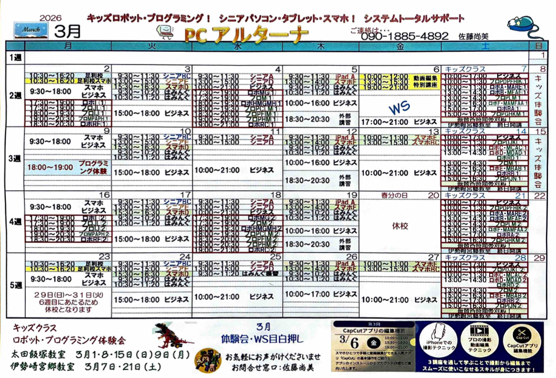 太田教室 2026年3月 無料体験会随時受付中です! 2026年2月 各クラス無料体験会随時受付中! 足利教室 2026年3月 足利校シニアパソコン・スマホ体験会開催! お気軽にお問合せください! 2026年2月 無料体験随時受付中! 伊勢崎教室 2026年3月 無料体験会随時受付中! 2026年2月 随時無料体験受付中!